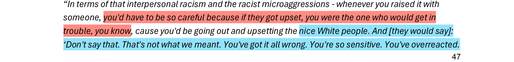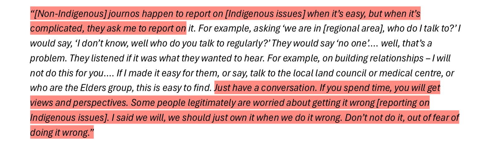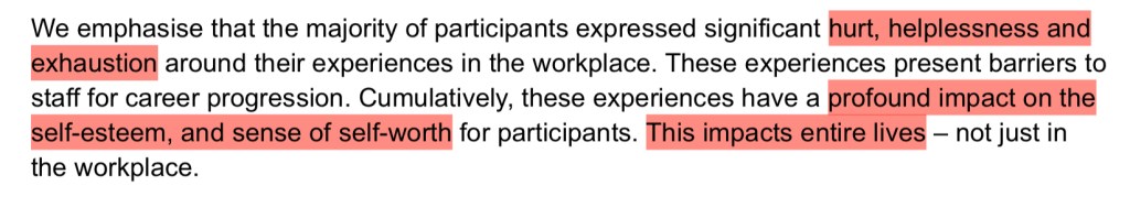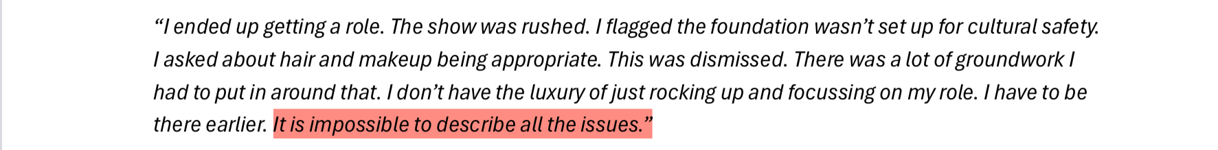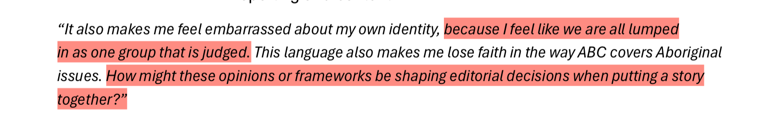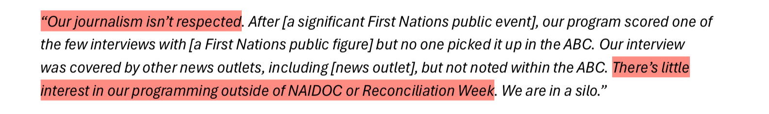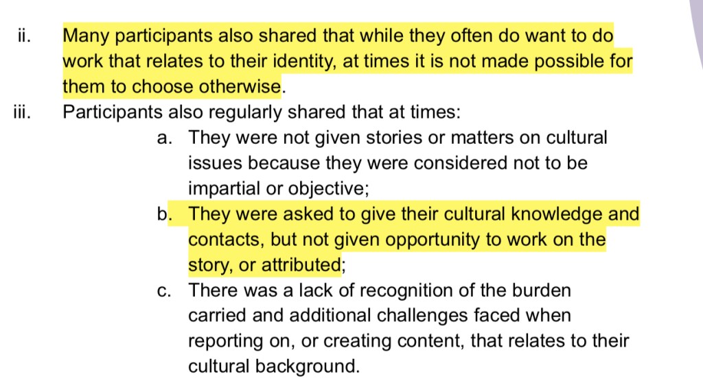 Findings from the report will largely not be anything new to First Nations people even from outside the media industry, as aptly pointed out by a few of the participant answers; racism experienced within the ABC was indistinguishable from racism playing out in other life areas.