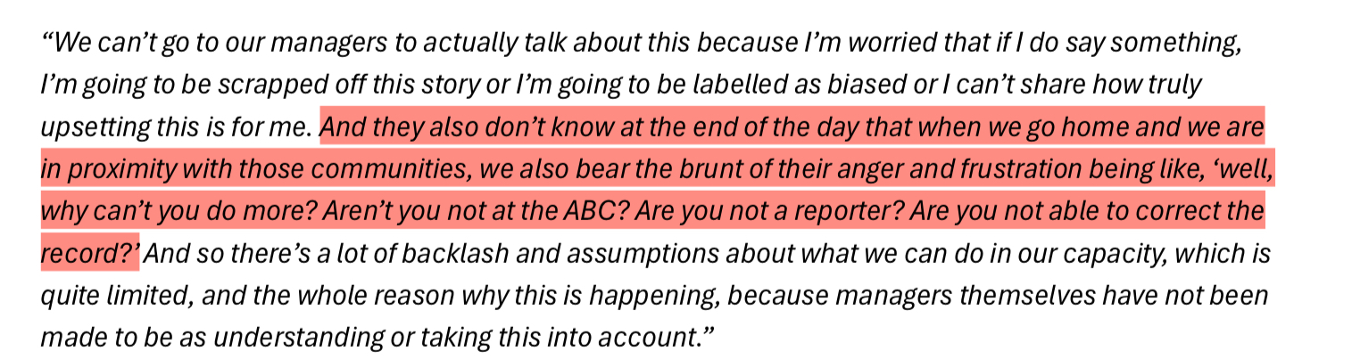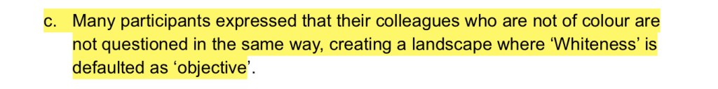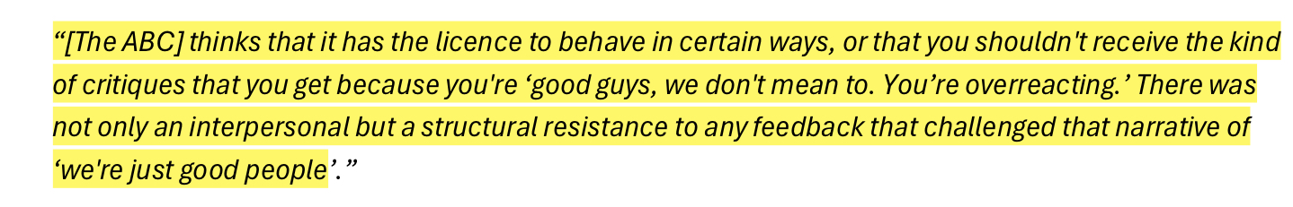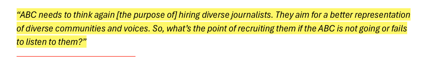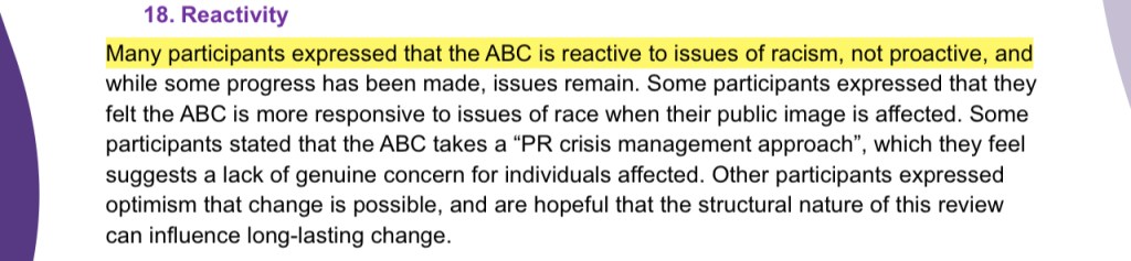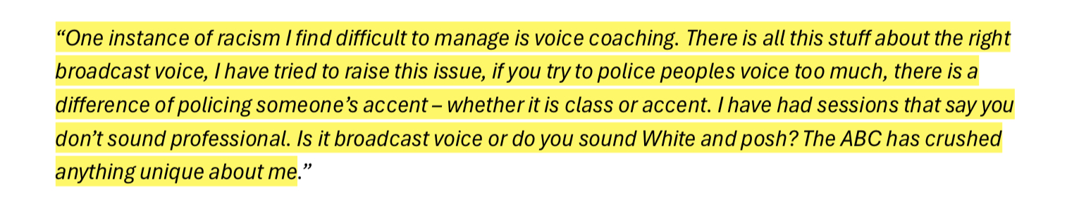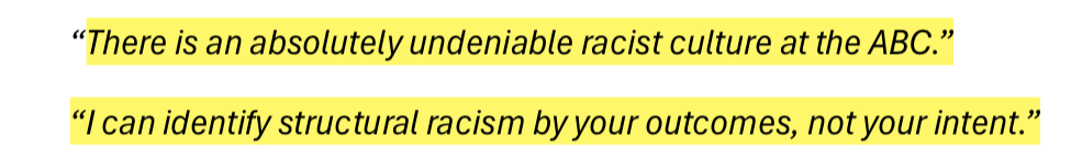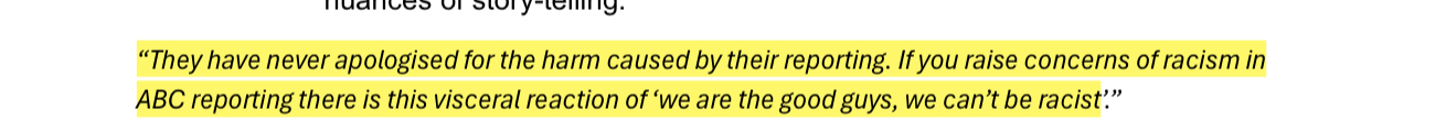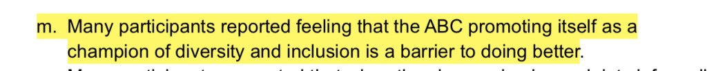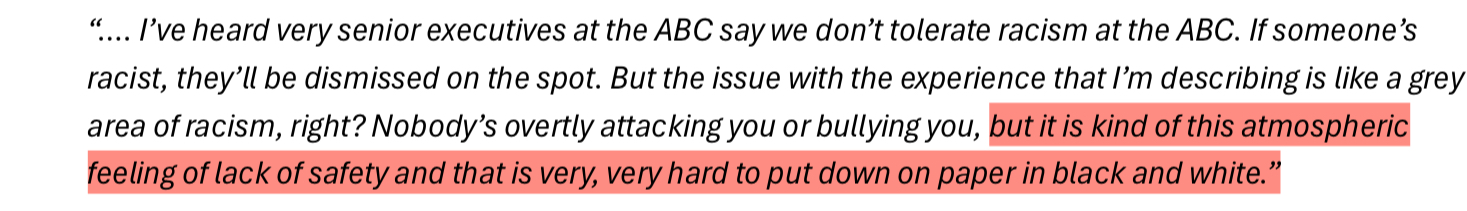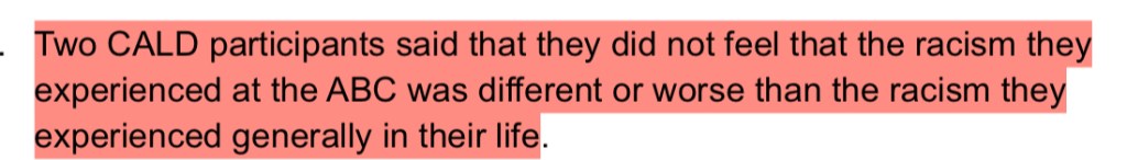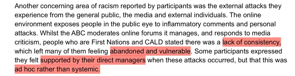 Independent Review into ‘ABC Systems and Processes in Support of Staff who Experience Racism’ involved 120 participants. Only one of them claimed to have no direct and personal experience with racism inside the ABC; but 100% of them claimed to have been witness to it throughout their time at ABC. I have inserted a slideshow immediately below with the participant responses that stood out most to me.