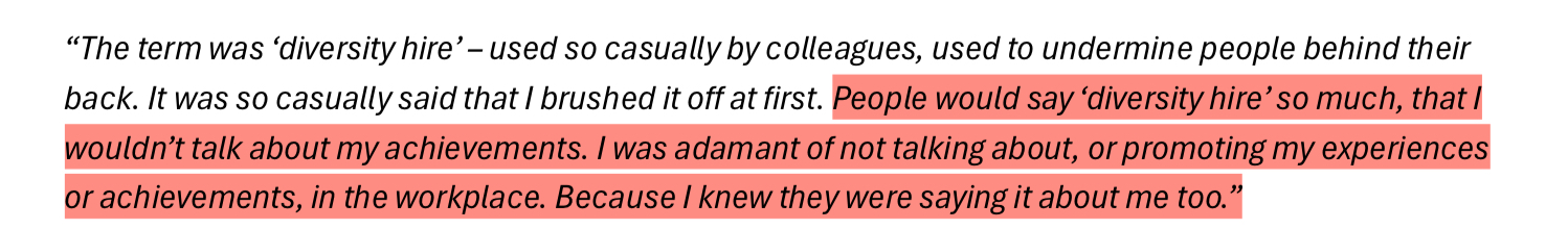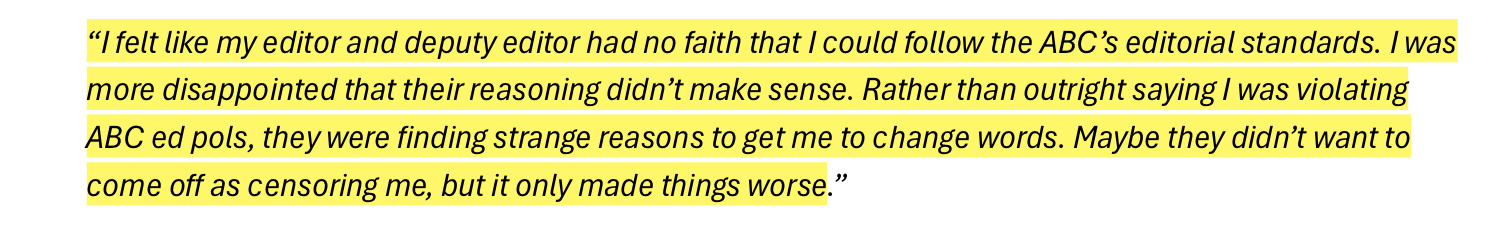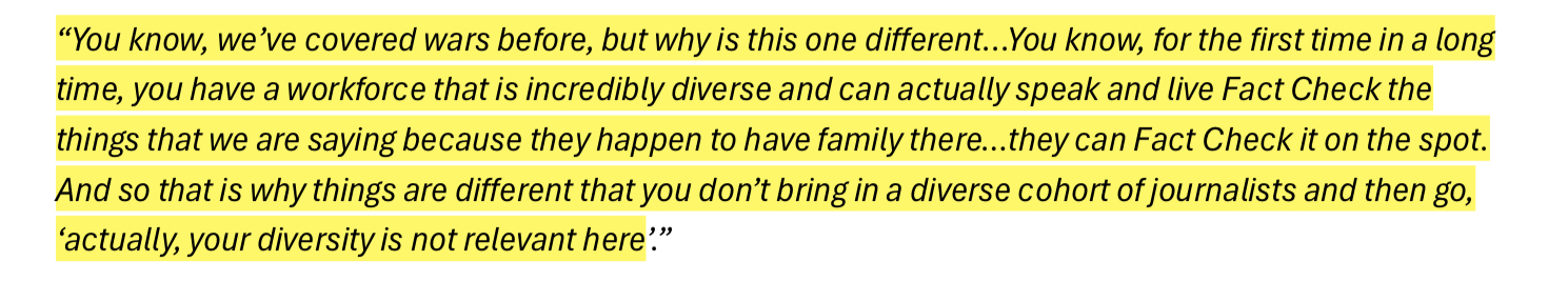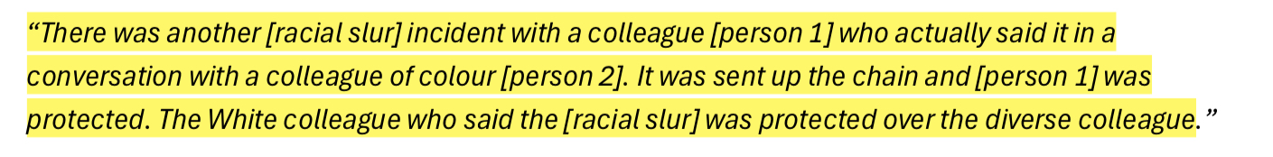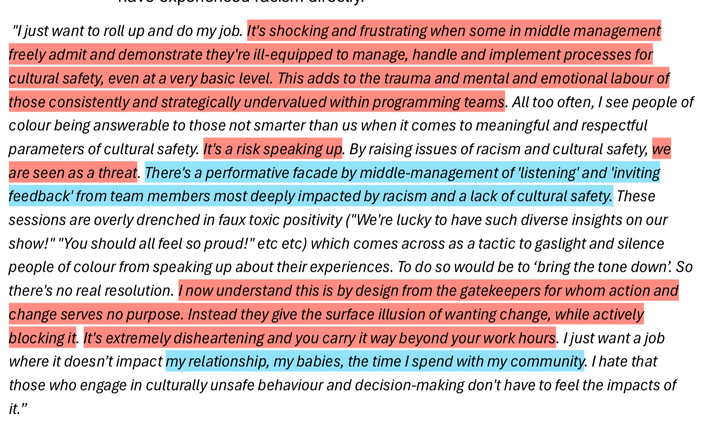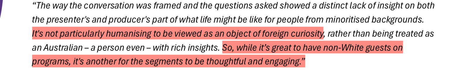 Independent Review into ‘ABC Systems and Processes in Support of Staff who Experience Racism’ involved 120 participants. Only one of them claimed to have no direct and personal experience with racism inside the ABC; but 100% of them claimed to have been witness to it throughout their time at ABC. I have inserted a slideshow immediately below with the participant responses that stood out most to me.