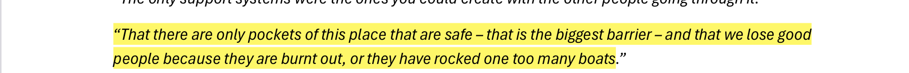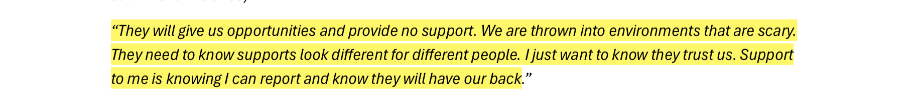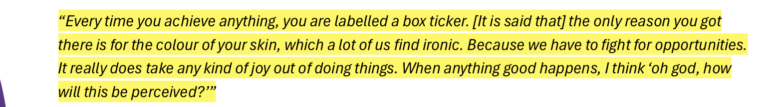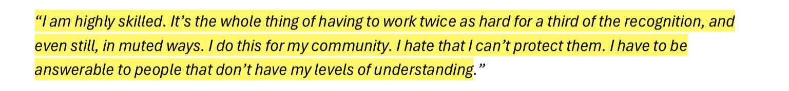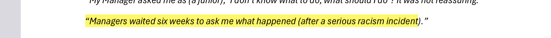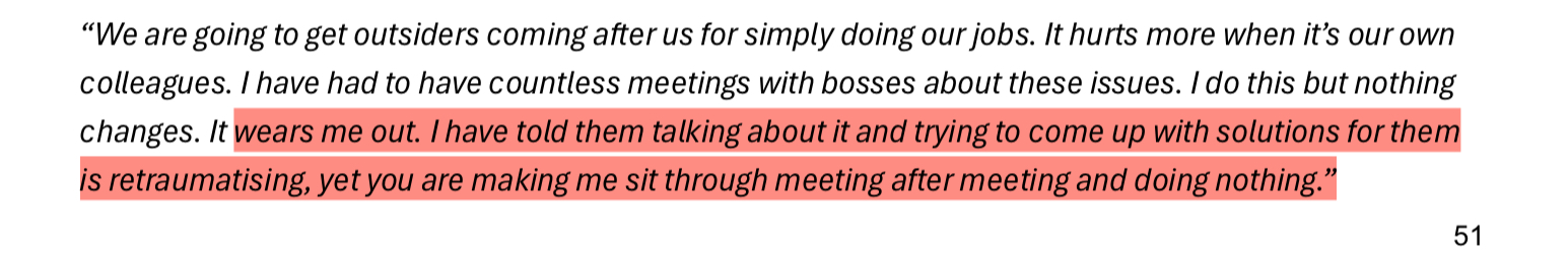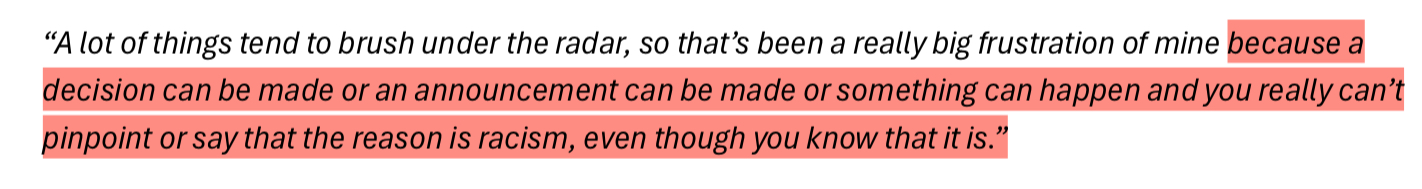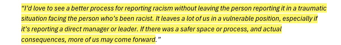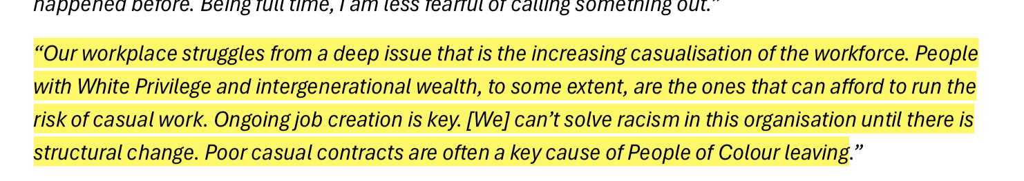 These responses and a few other datasets were compiled together into a list of key-findings that contribute to the internal problem of racism at the ABC. Some of these findings included things like lack of social media moderation, pigeon-holing regardless of career progression and direction desire, excessive cultural load, and mental-health issues + suicidal ideation from lack of formal supports, a fear of reporting harmful events and much more. There is another slide show below of the ones I found particularly interesting.