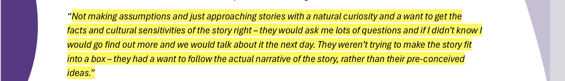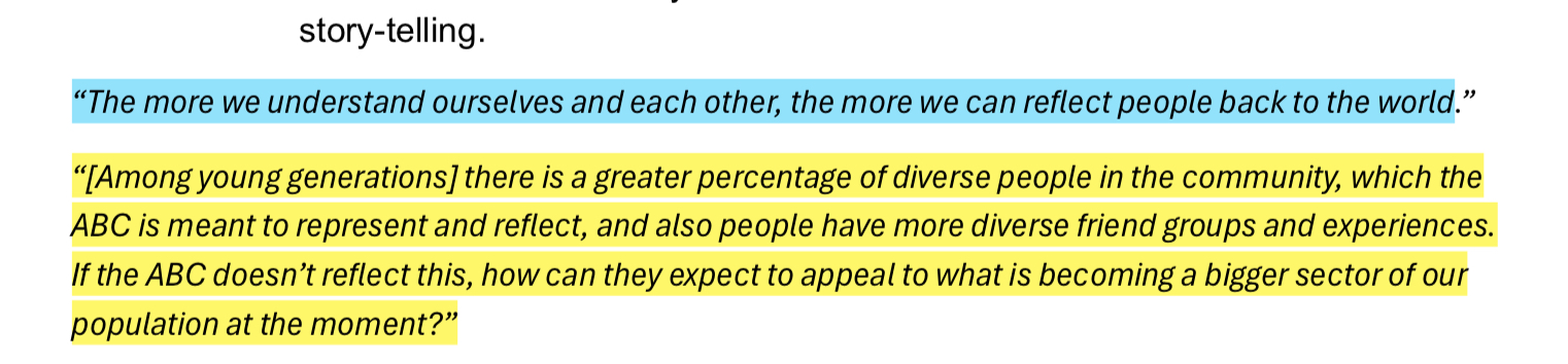 3 – That the ABC should enhance understanding of how lived experience shapes story-telling.