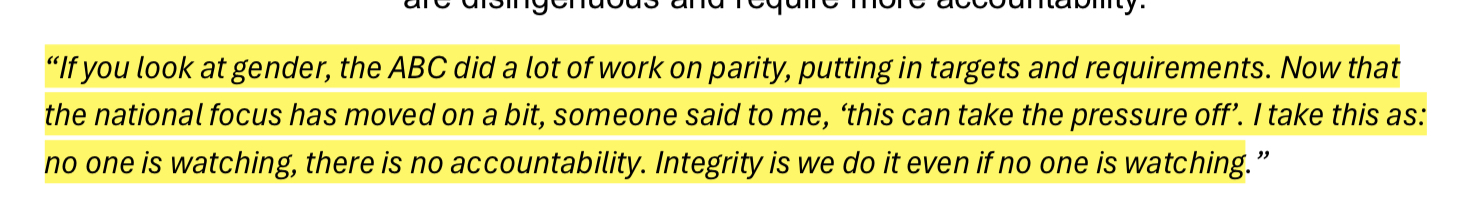 However, the entire process of this review from start to finish was extremely public facing and under the leadership of a director who already has plans to retire. There is already a huge amount of pressure put on people in positions of power to be visible making the right decision – but whether or not they follow through behind closed doors and away from cameras with questions is another story. This particular public discourse generated a lot of scrutiny compared wirh other recent ABC scandals and being both public facing and towards the end of your career come with a unique set of challenges that I imagine would escalate the pressure one feels facing these types of scenarios. So, it is for those reasons I eagerly await just how accountable the ABC and any incoming directors are willing to hold themselves in their actions beyond words and performative public displays.