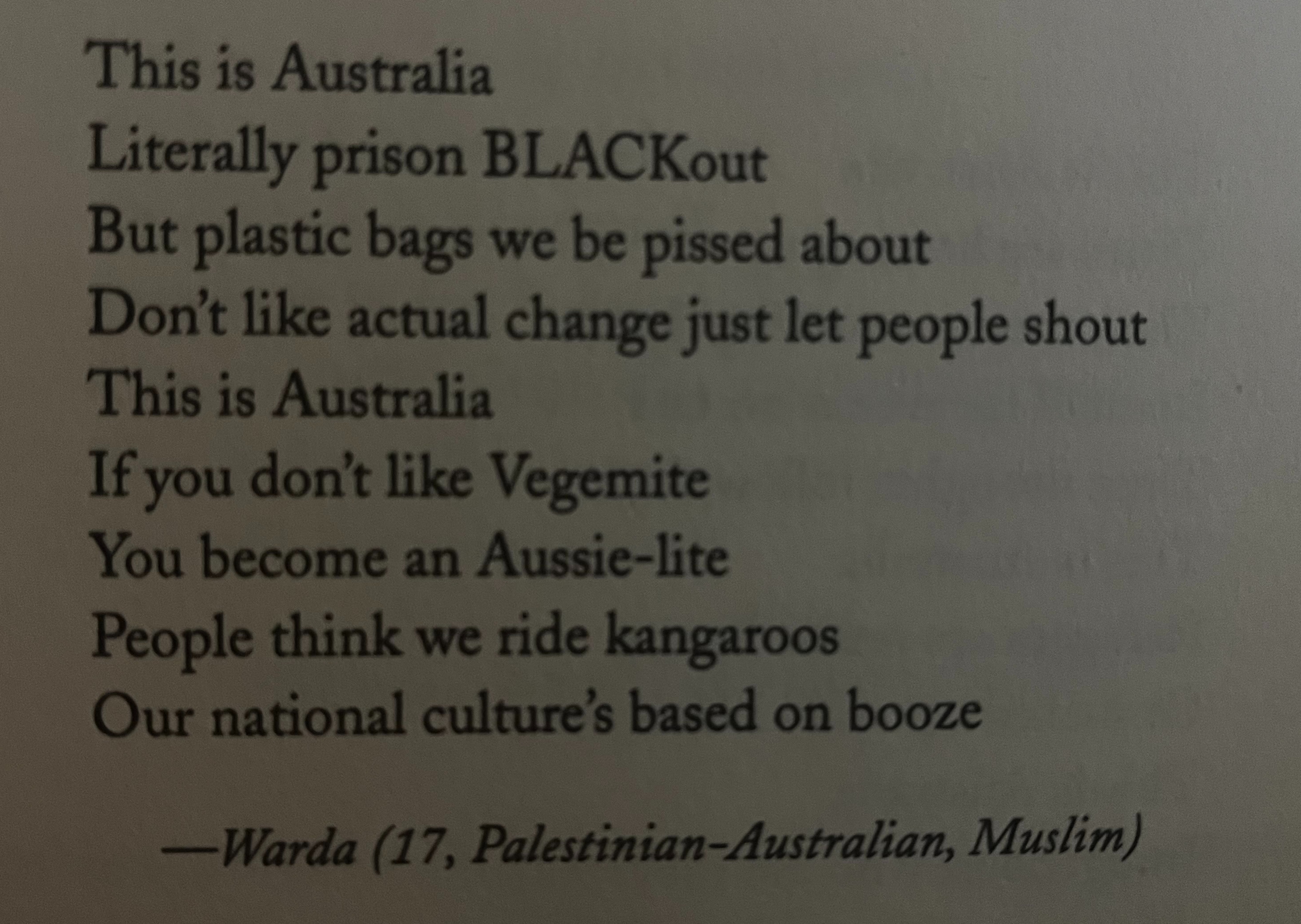 The chapter of the book I memorised that from has a bunch of great poems by Sydney teens about how Australia makes them feel based off of the song and music video of Childish Gambino’s ‘This is America’ that one is just easiest and quickest to make flow off the tongue.